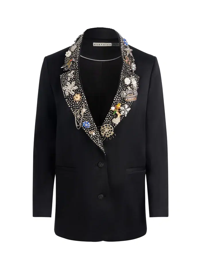 The Elna Embellished Blazer from Alice + Olivia is a modern answer to fall’s love for layering. It takes the structure of a classic black blazer and infuses it with texture and sparkle. The intricate embellishment catches light in a subtle way, turning something traditionally simple into something that instantly feels special. It is polished yet playful, and it has the rare ability to make casual pieces look elevated without ever feeling overdressed.
